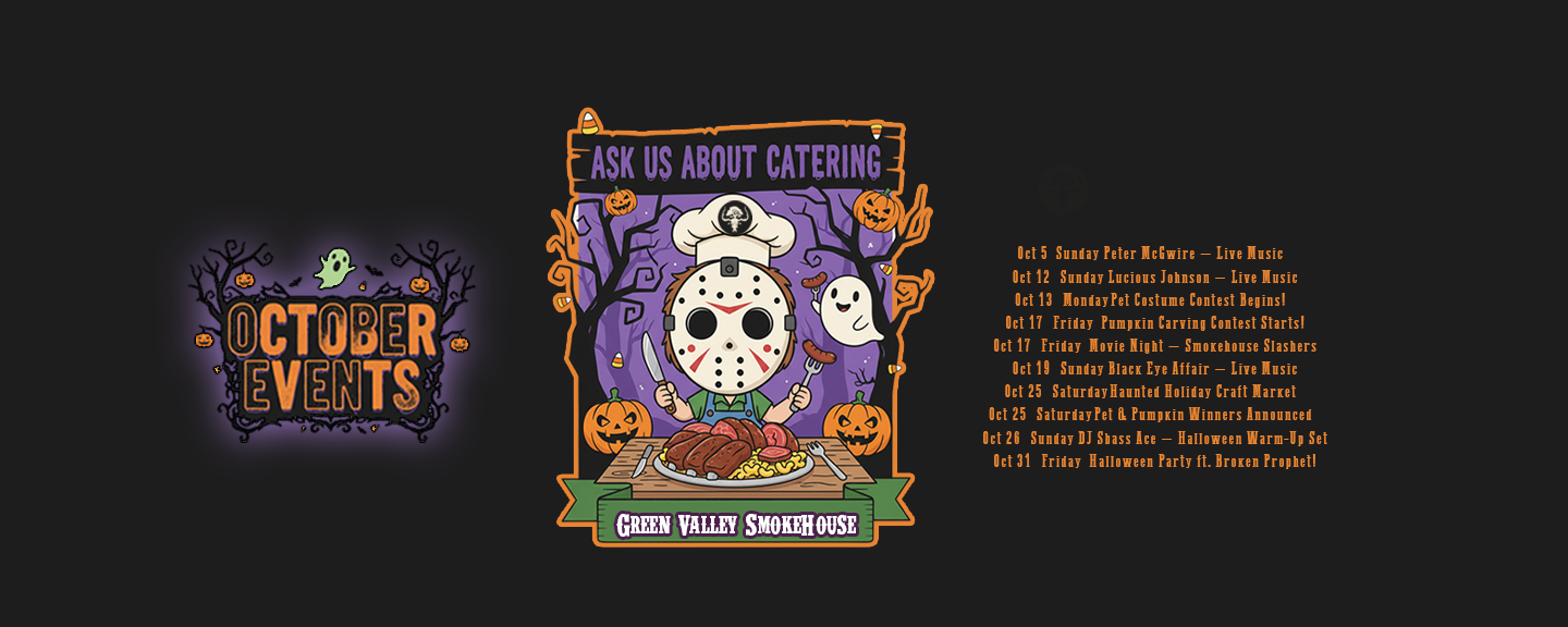 Oct 21 Taco Tuesdays Tuesday, October 21, 2025 4:00 PM 5:00 PM Green Valley Smokehouse (map) Google Calendar ICS Every Tuesday! View Event → Oct 17 Friday Night Movie Night! Friday, October 17, 2025 6:30 PM 7:30 PM Green Valley Smokehouse (map) Google Calendar ICS View Event → Oct 14 Taco Tuesdays Tuesday, October 14, 2025 4:00 PM 9:00 PM Green Valley Smokehouse (map) Google Calendar ICS Every Tuesday! View Event → Oct 12 Lucious Johnson Live Sunday, October 12, 2025 2:00 PM 5:00 PM Green Valley Smokehouse (map) Google Calendar ICS View Event → Oct 10 Friday Night Movie Night! Friday, October 10, 2025 6:30 PM 8:30 PM Green Valley Smokehouse (map) Google Calendar ICS View Event → Oct 7 Taco Tuesdays Tuesday, October 7, 2025 4:00 PM 9:00 PM Green Valley Smokehouse (map) Google Calendar ICS Every Tuesday! View Event →